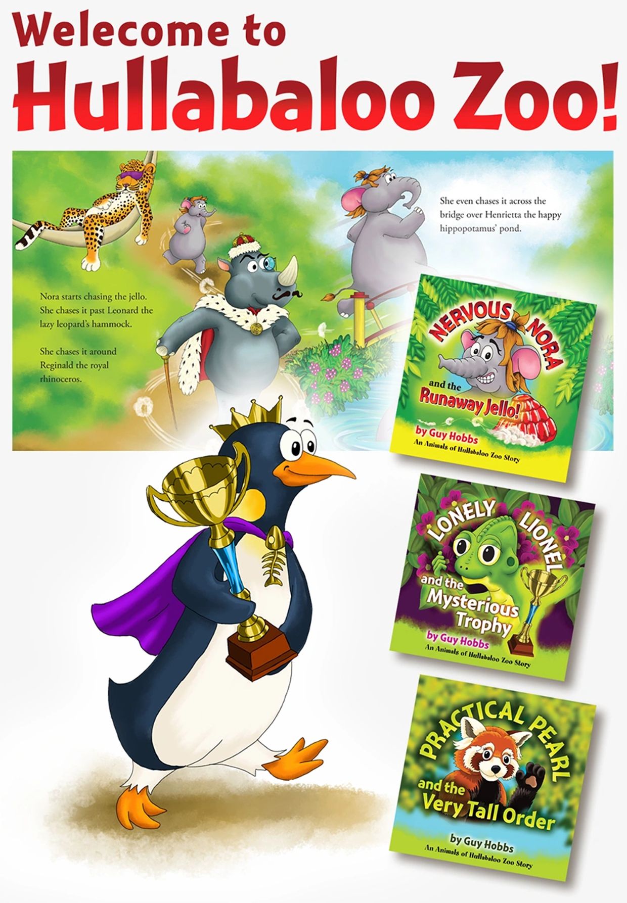 In my children's book series 'Hullabaloo Zoo' you can meet a range of characters from Nervous Nora the elephant to Lonely Lionel the Chameleon and Practical Pearl the red panda along with their host of friends as they face and overcome various challenges and adventures.